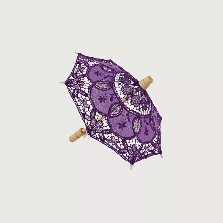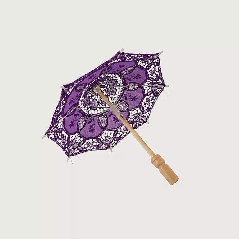 مظلة ديكور مصنوعة من الدانتيل باللون البنفسجي, مريحة للحمل ومناسبة للحفلات أو لجلسات التصوير.