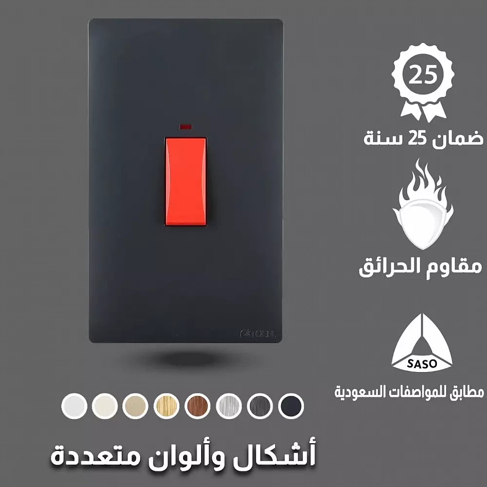 المسميات الدارجة :مفتاح مكيف / مفتاح تشغيل وإيقاف 45 امبير لمحة عامة : يستخدم في التحكم بالمرور التيار الكهربائي الى أجهزة التكييف بتوصيل وإيقاف التيار .المميزات/تفاصيل وحواف مثالية للجدارمع إضاءة حمراء توضح عمل المفتاح تحمل جهد عالي 45 امبير.توصيل تيار كهربائي أمن وسريع مظهر عملي وفريد سهلة التركيب والفك هيكل خارجي من البلاستيك المعالج ذات جودة عالية الغطاء الخارجي معزول كهربائيا حماية متكاملة مصنوعة من مادة PS المقاومة للاحتراق والاشتعال نقطة توصيل كهربائي سريع وآمن مواد داخلية موصلة بكفاءة مصنوعة من النحاس حاصل على شهادة الهيئة السعودية للمواصفات والمقاييس والجودة ضمان طويل المدى 25 سنة يستبدل فورا بشكل مجاني في أحد فروعنا المنتشرة حول المملكة معدل الجهد 220V الى 250V تفاصيل المنتج نوع المفتاح مفتاح مكيف ابعاد المنتج 7x14cm نوع التركيب غاطس في الحائط لون الغطاء اسود خام تفاصيل الضمان عدد سنوات الضمان 25 سنة مواصفات أخرى مطابقة للمواصفات السعودية والخليجية نعم