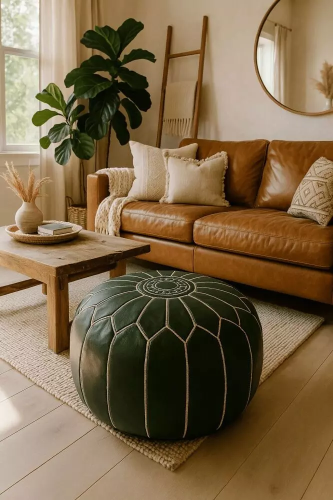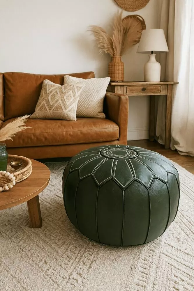 بوف جلدي طراز مغربي فاخر – لمسة أصيلة في ديكور منزلك أضف لمسة من الفخامة الشرقية والدفء الريفي إلى ديكور منزلك مع هذا البوف المغربي المصنوع يدويًا من الجلد الصناعي. تصميمه المستوحى من الزخارف التقليدية يدمج بين التراث والحداثة، ليكون قطعة ديكور وعملية في آنٍ واحد.