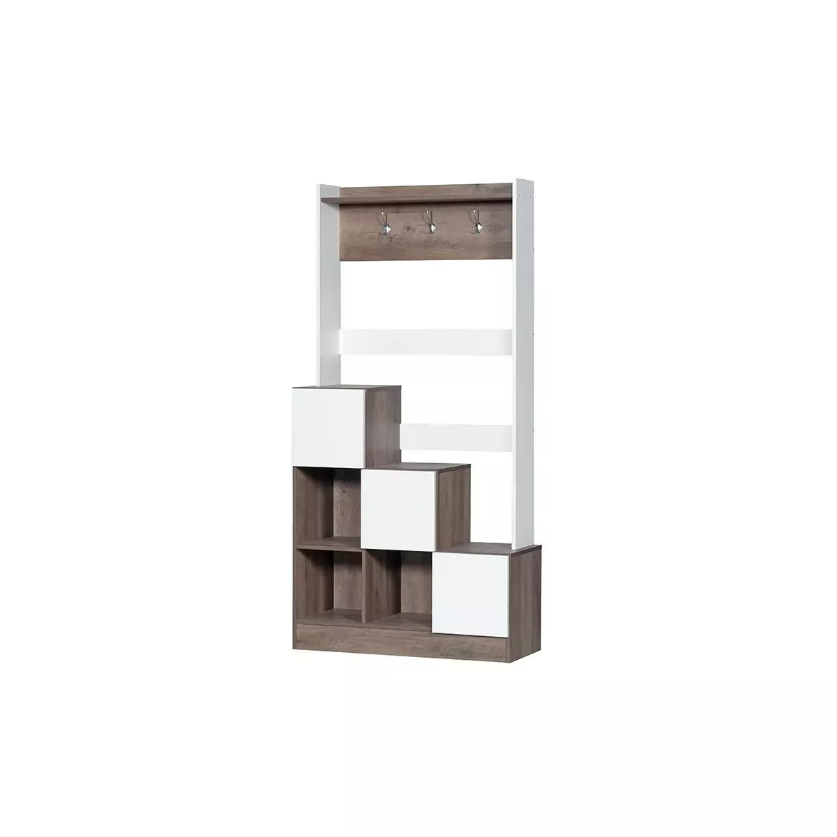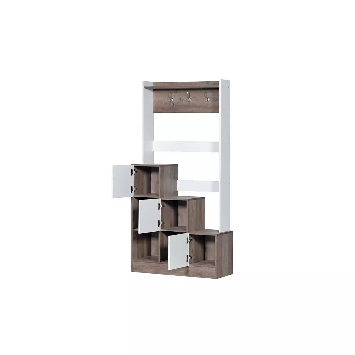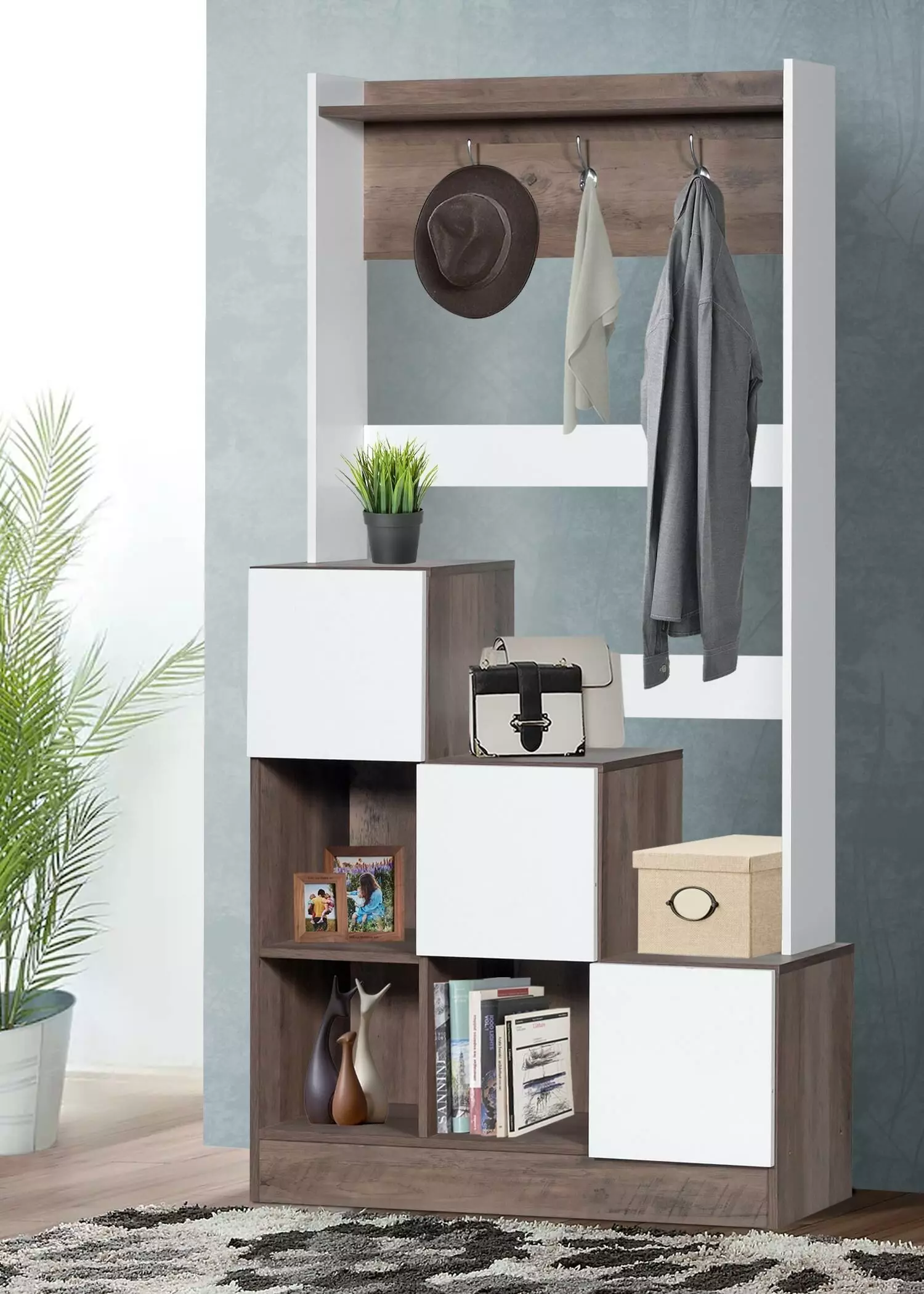مواصفات ومميزات وحدة تخزين ميشيا رفوف وأدراج مع ستاند تعليق خشب ماليزي - خشبي وأبيض : تصميم الوحدة بشكل متدرج من 3 أدوار , تتضمن رفوف مفتوحة ومغلقة بأبواب مع علاقات للملابس . مصنوعة بحرفية فائقة من الخشب الماليزي عالي الجودة المصقول بعناية ليضمن المتانة الدائمة الوحدة مطلية بألوان ثابتة مع الزمن ومتوافقة مع تشكيلة مختلفة من قطع الأثاث. تصميم عصري بسيط يلائم جميع ديكورات المنزل المودرن والكلاسيكية. الرفوف ذات مساحة كافية تساعدك على ترتيب كميات كبيرة من المقتنيات. الرفوف المفتوحة تمكنك من عرض الاكسسورات والتحف والنبتات المميزة لك بشكل عصري وانيق. تسمح لك الرفوف المغلقة بتخزين بعض المقتنيات بمعزل عن الانظار. تتميز الأبواب بسهولة الفتح والإغلاق بفضل متانتها وتصميمها المميز. يمكنك مع وحدة التخزين ترتيب الكتب والاكسسوارات والتحف المختلفة وترتيبها وفق ذوقك. كما تتيح لك العلاقات تعليق المعاطف والقبعات والشالات وأي شيء تحتاجه عند الخروج من المنزل. متعددة الاستخدامات, جذابة, ومتينة وتدوم مع الزمن عند الالتزام بتعليمات العناية.