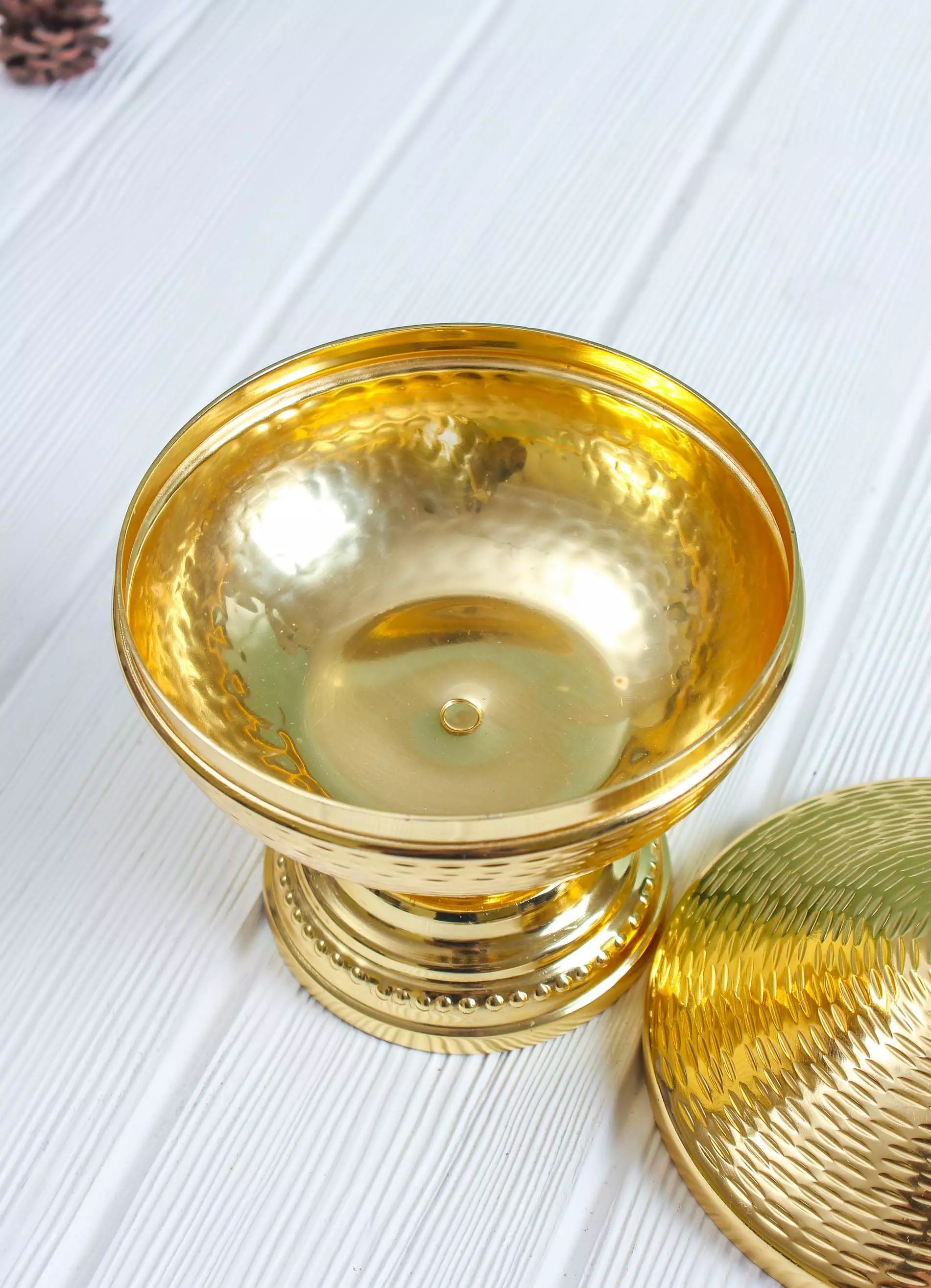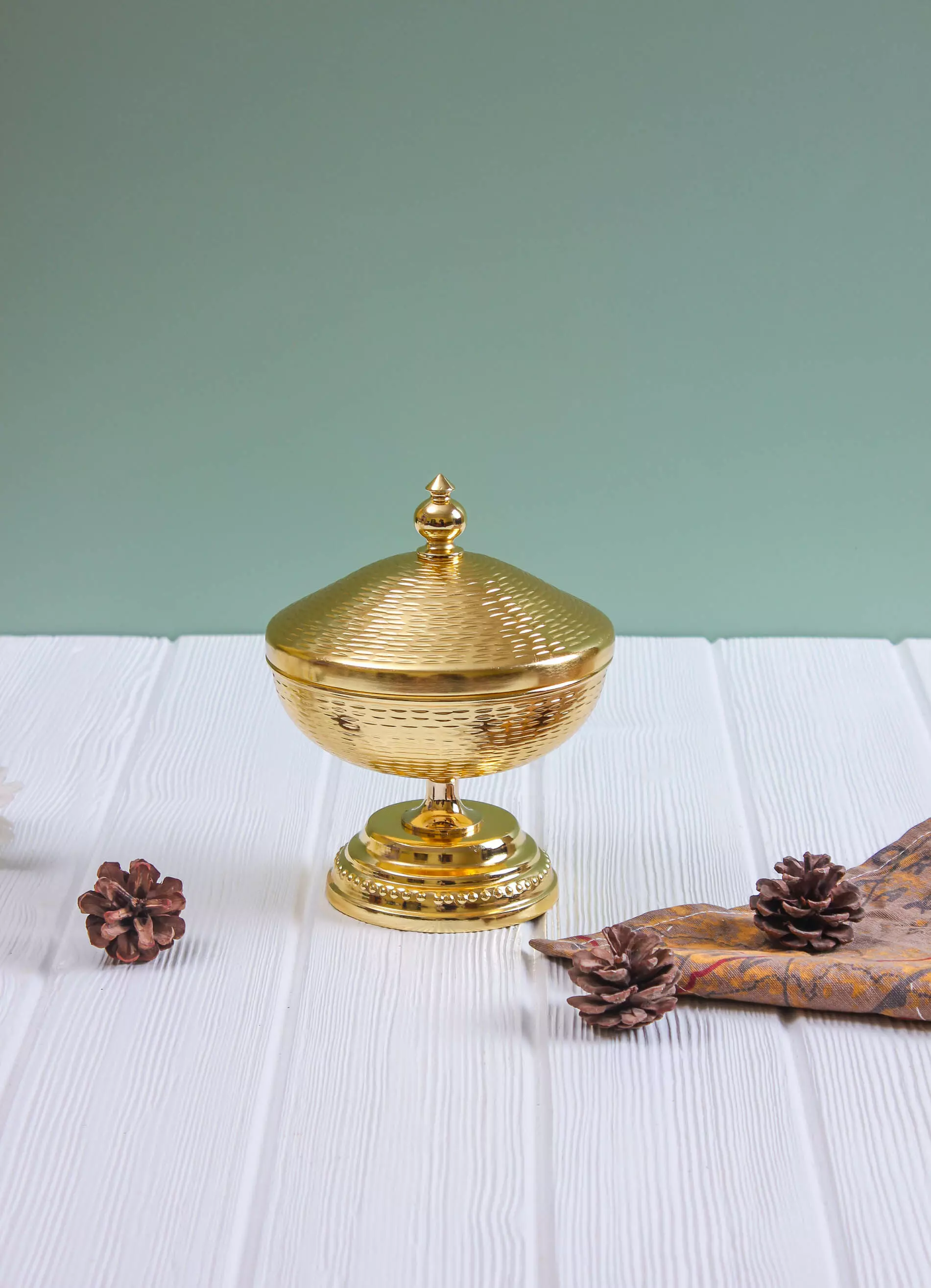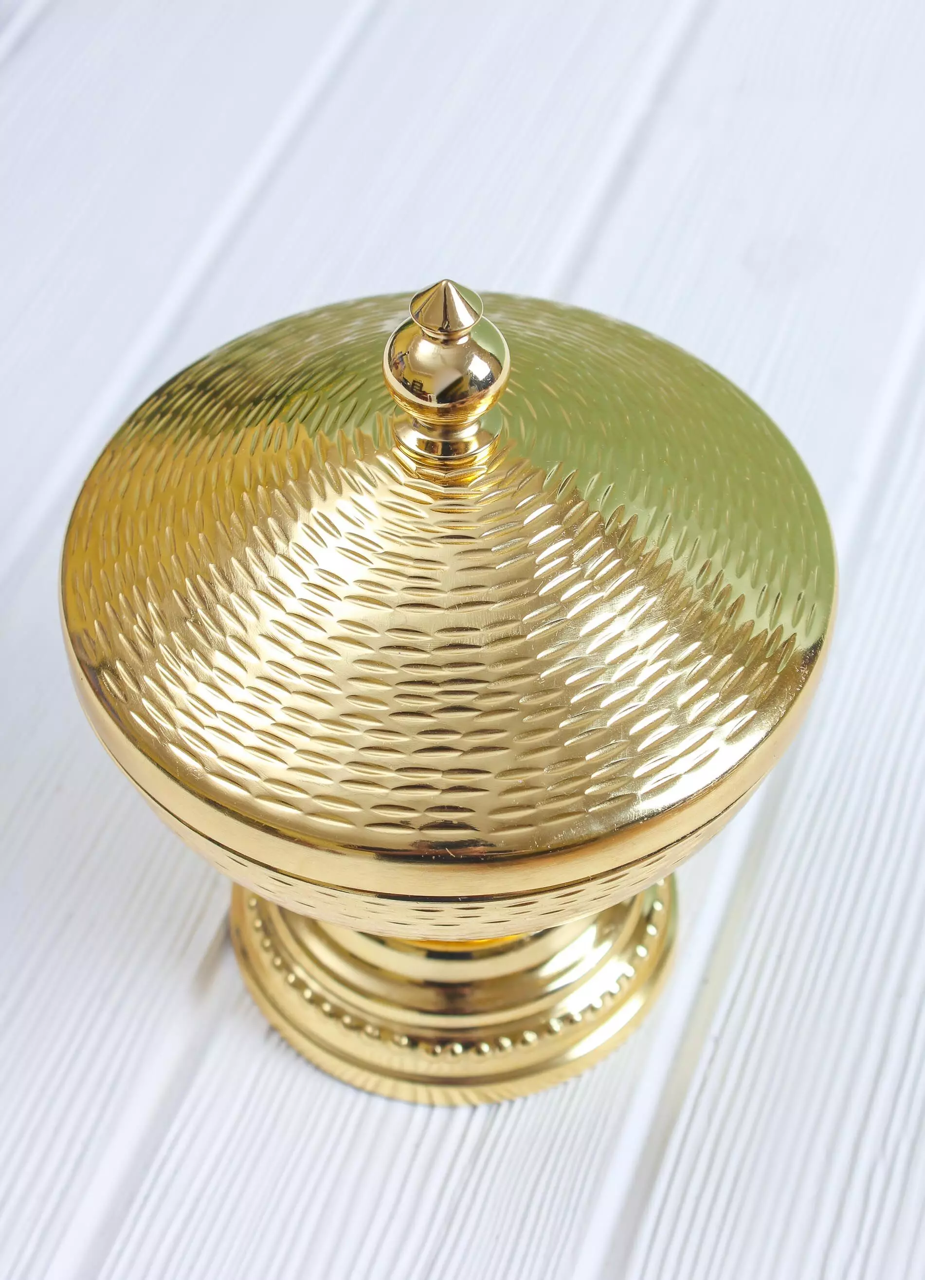 تمرية فاخرة وعملية مصنوعة يدوياً من قبل أمهر الحرفيين الهنود ومصممة بشكل جذاب وأنيق. يضمن الستيل بقاء التمور طازجة وصحية لفترة طويلة ويساعد في حمايتها الغطاء المحكم الإغلاق. تعطي القاعدة الشكل الشرقي الجذاب للتمرية وتؤمن ثباتها على سطح طاولة التقديم.