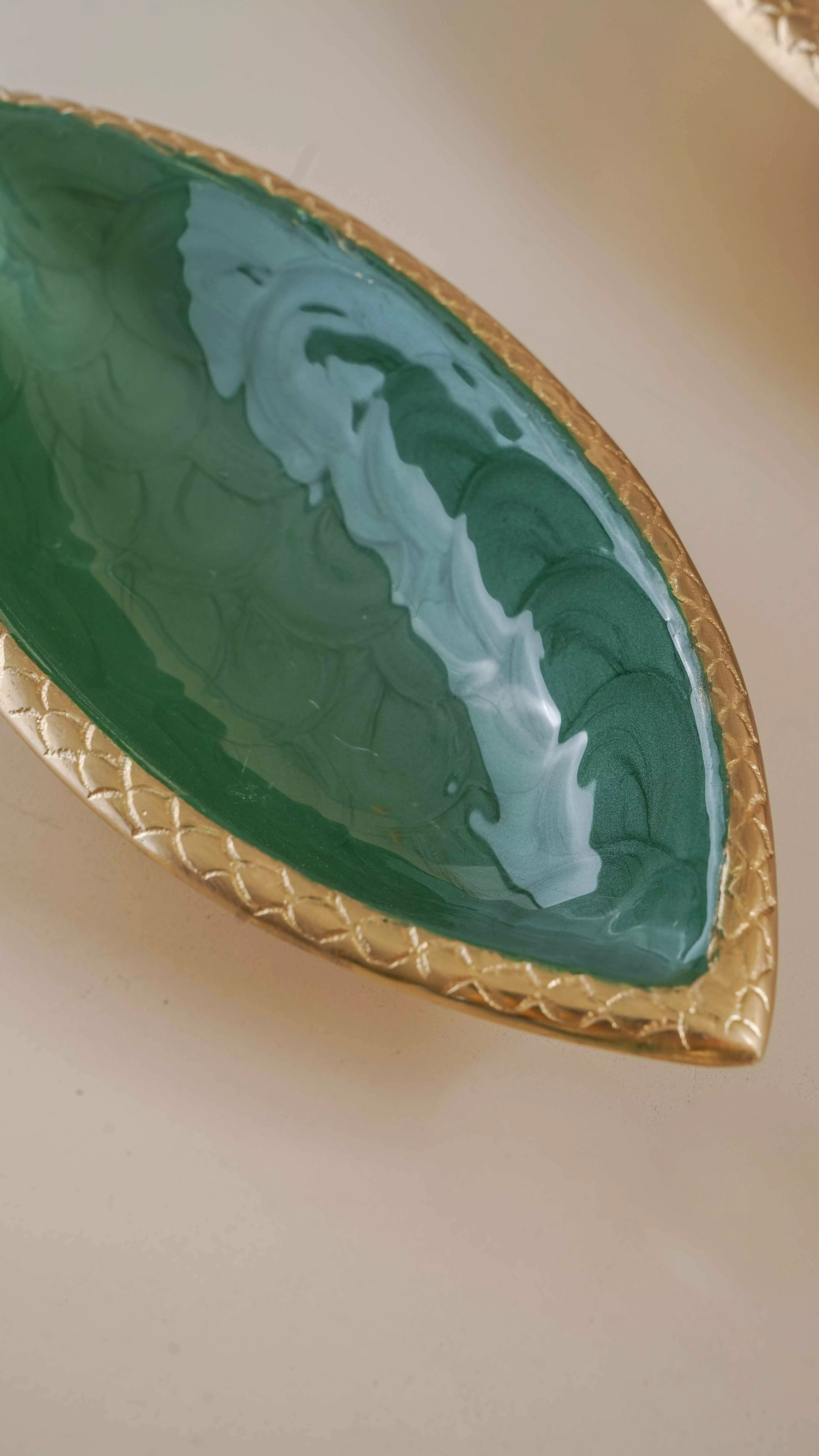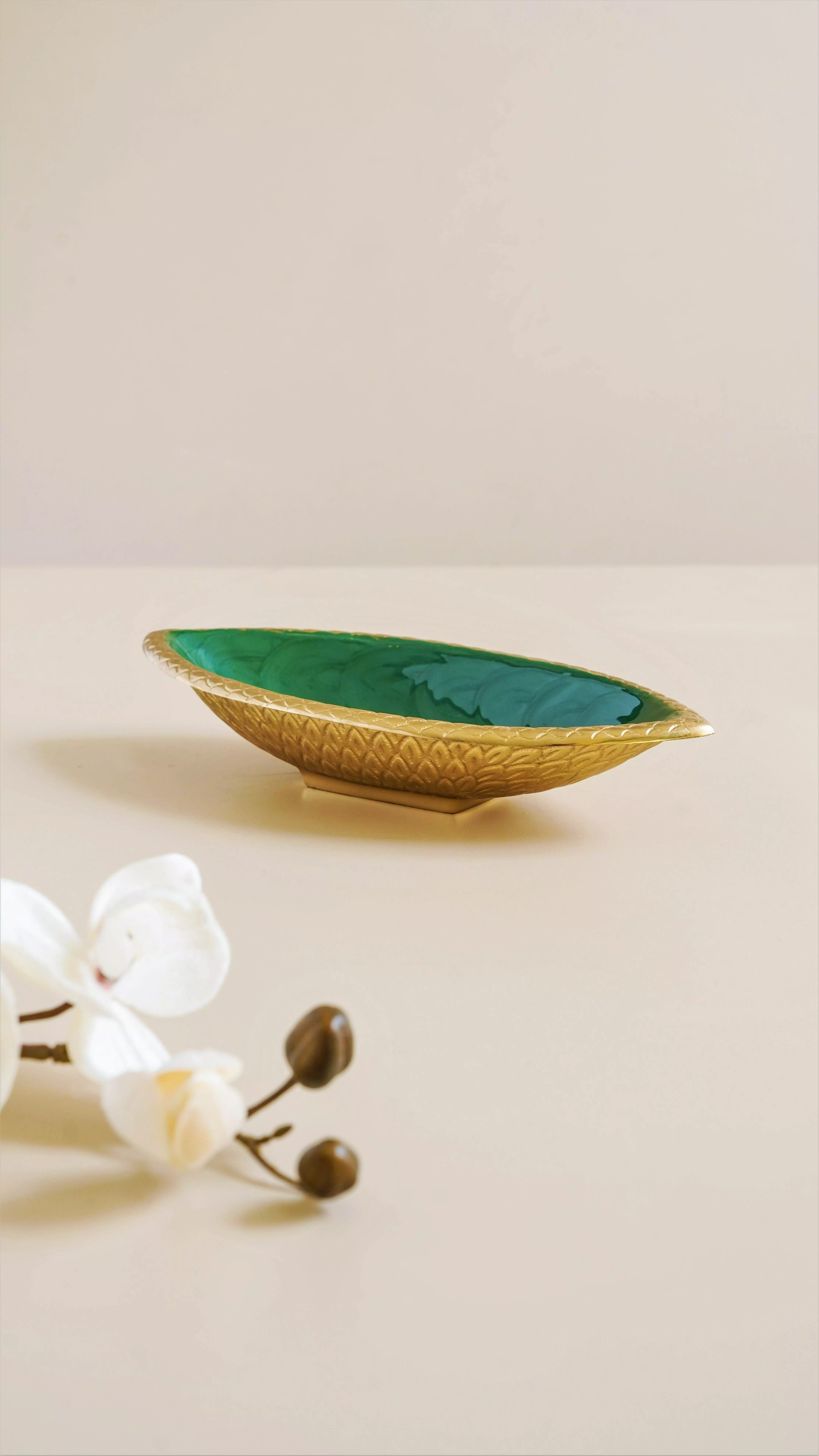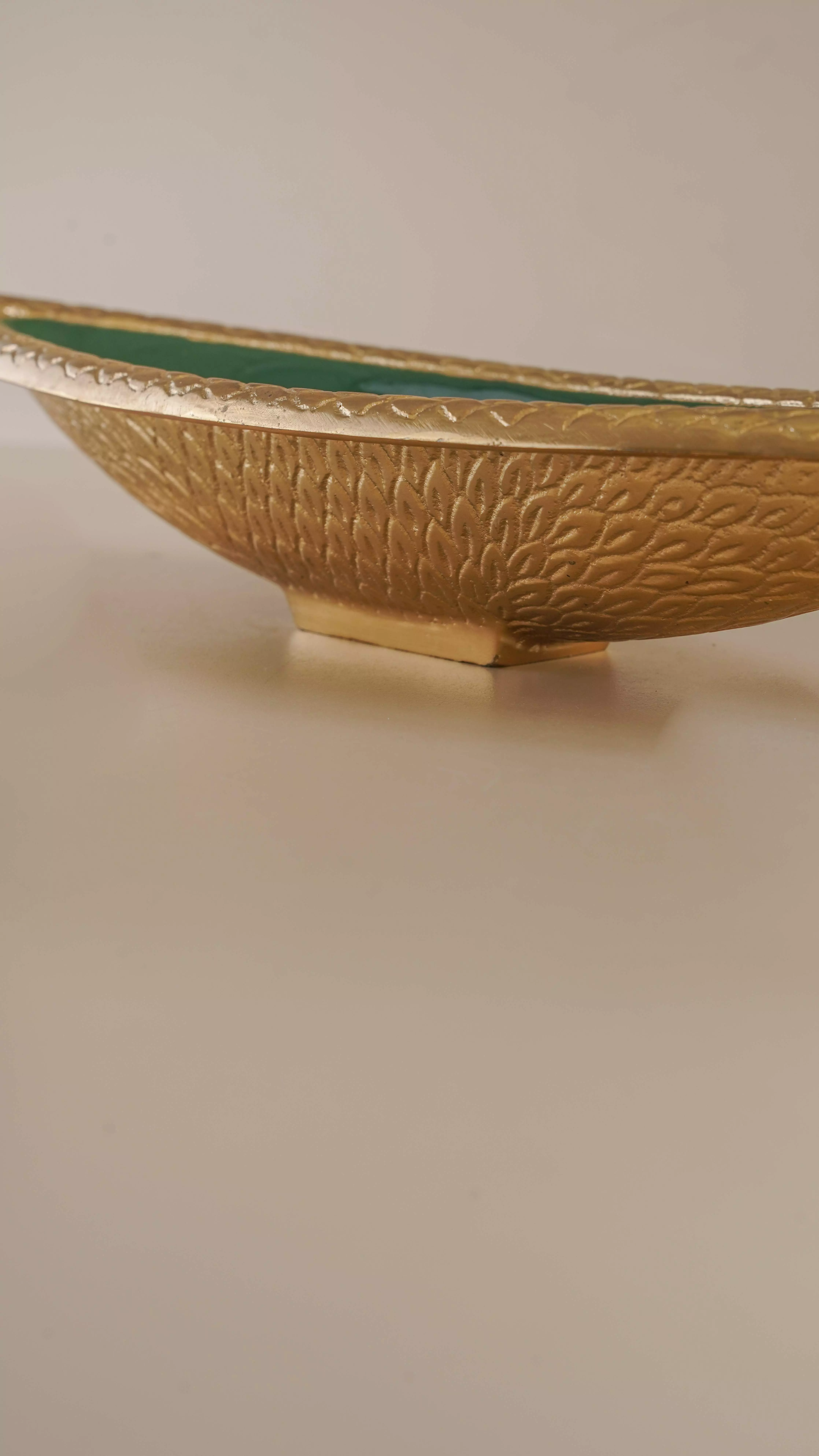 مواصفات ومميزات طبق تقديم كوهريك - حجم صغير, لون أخضر وذهبي: الطبق مصنوع من الستيل العالي الجودة والمتين والمصقول بعناية ليكون مقاوم لمختلف العوامل. الطبق مطلي بألوان عالية الجودة وصحية وثابتة مع الزمن عند الالتزام بتعليمات العناية. مقاسات طبق التقديم: الارتفاع 4 سم * الطول 13 سم * العرض 27 سم يمكنك استخدام الطبق لتقديم المكسرات والتمور والحلى والصلصات والشوكولاه وغيرها من انواع الضيافة فهو متعدد الاستعمالات الشكل البيضوي العميق للصحن يعطيه سعة مناسبة لتقديم كمية كبيرة من الضيافة.
