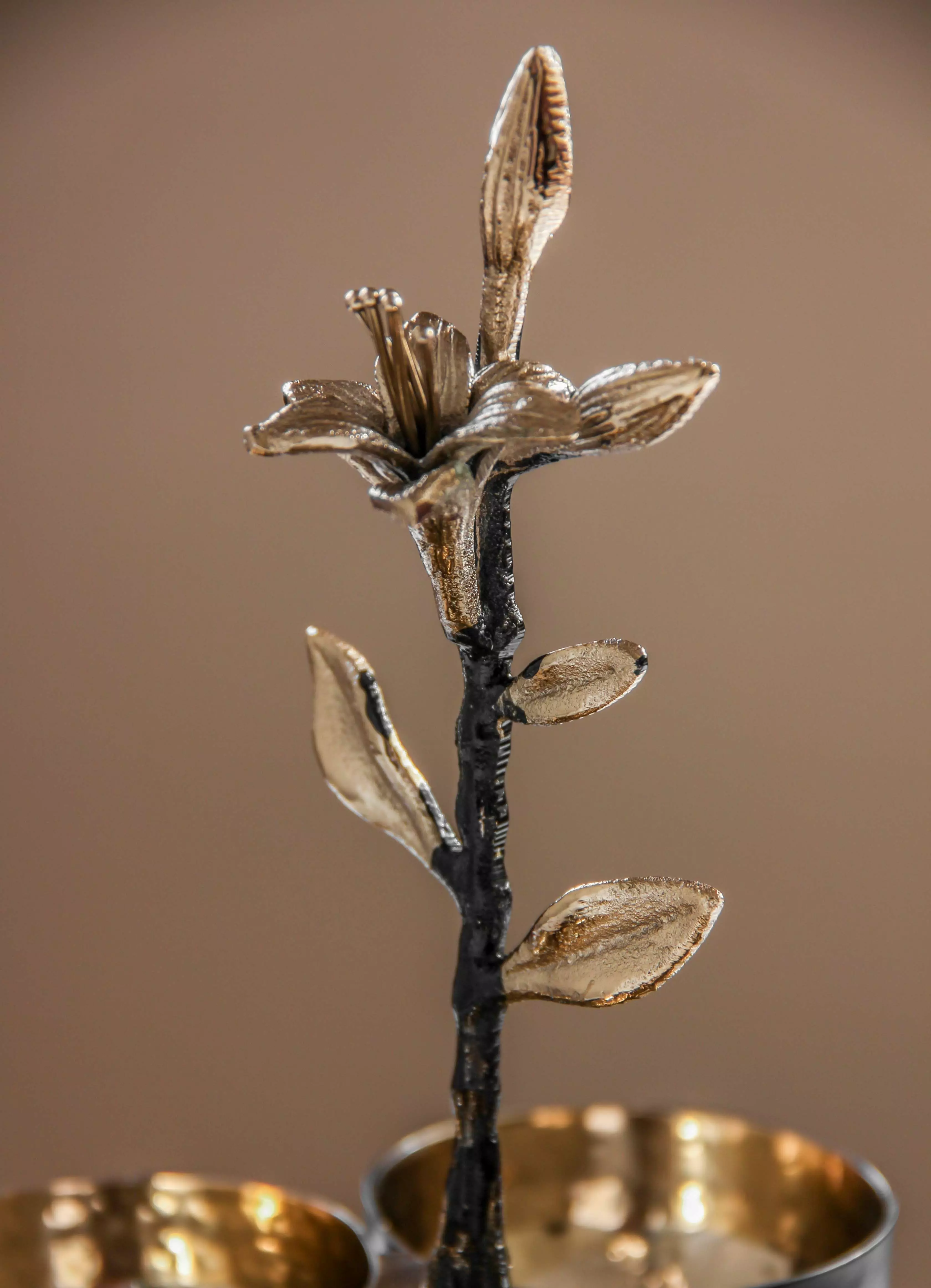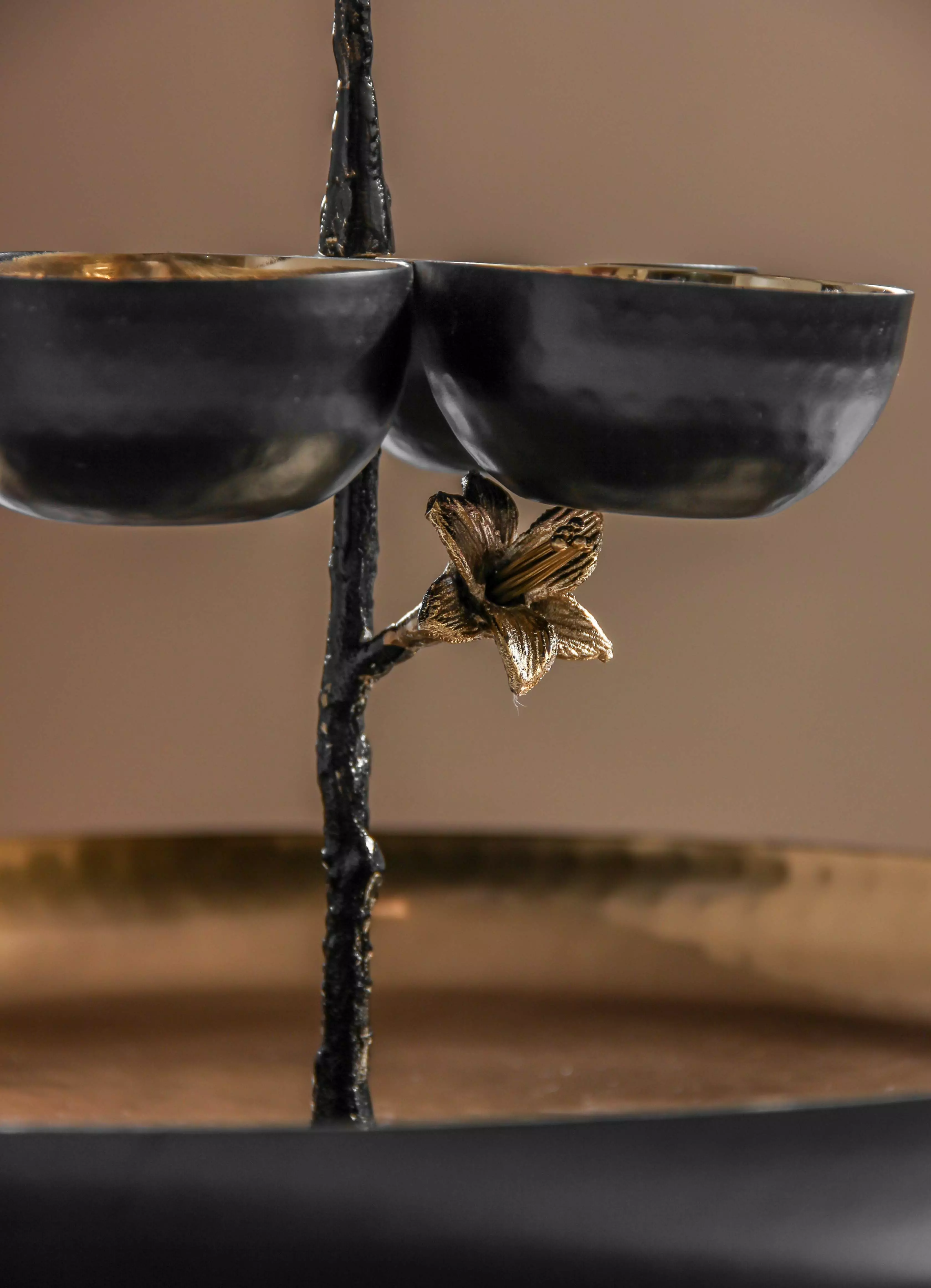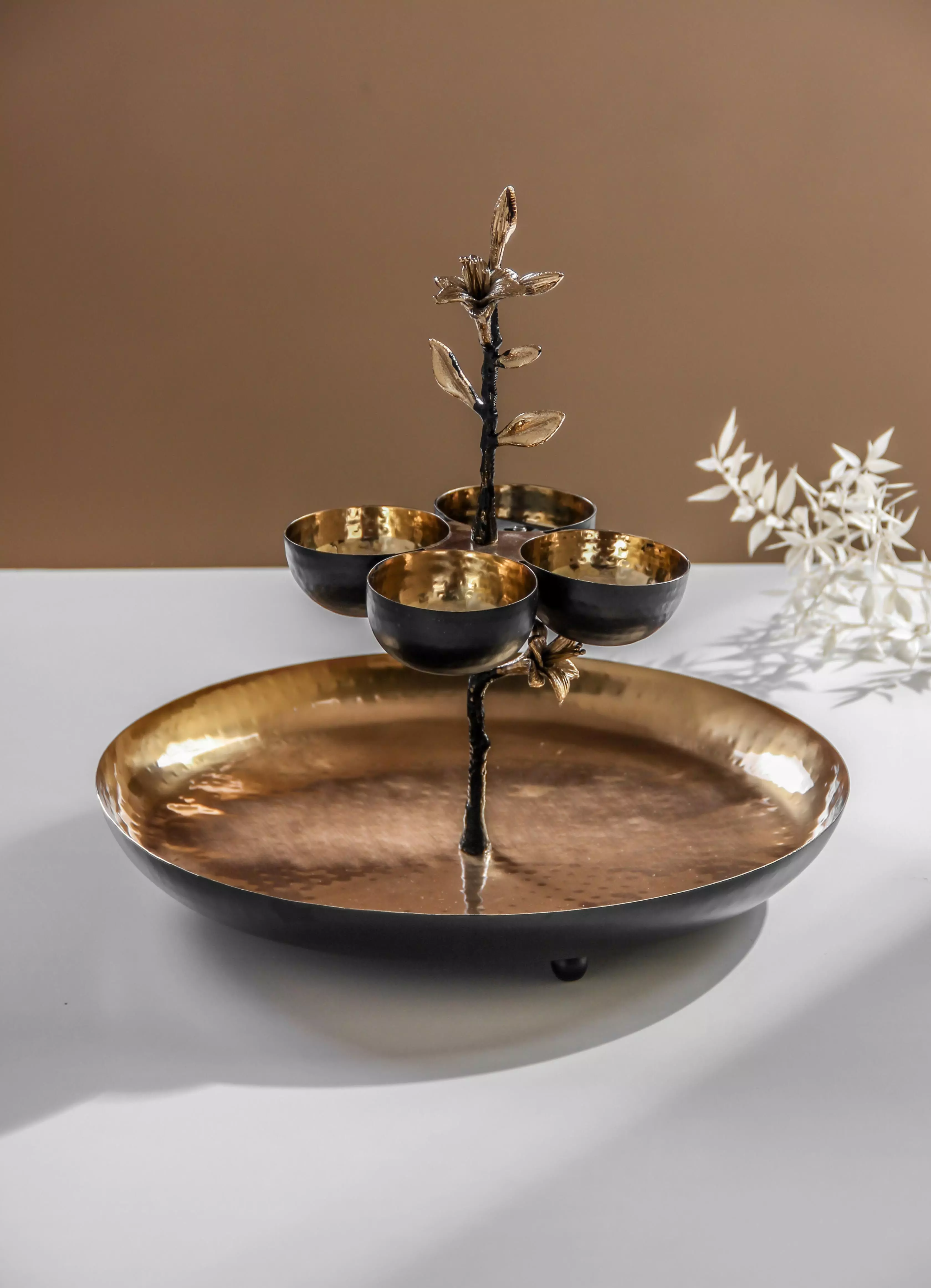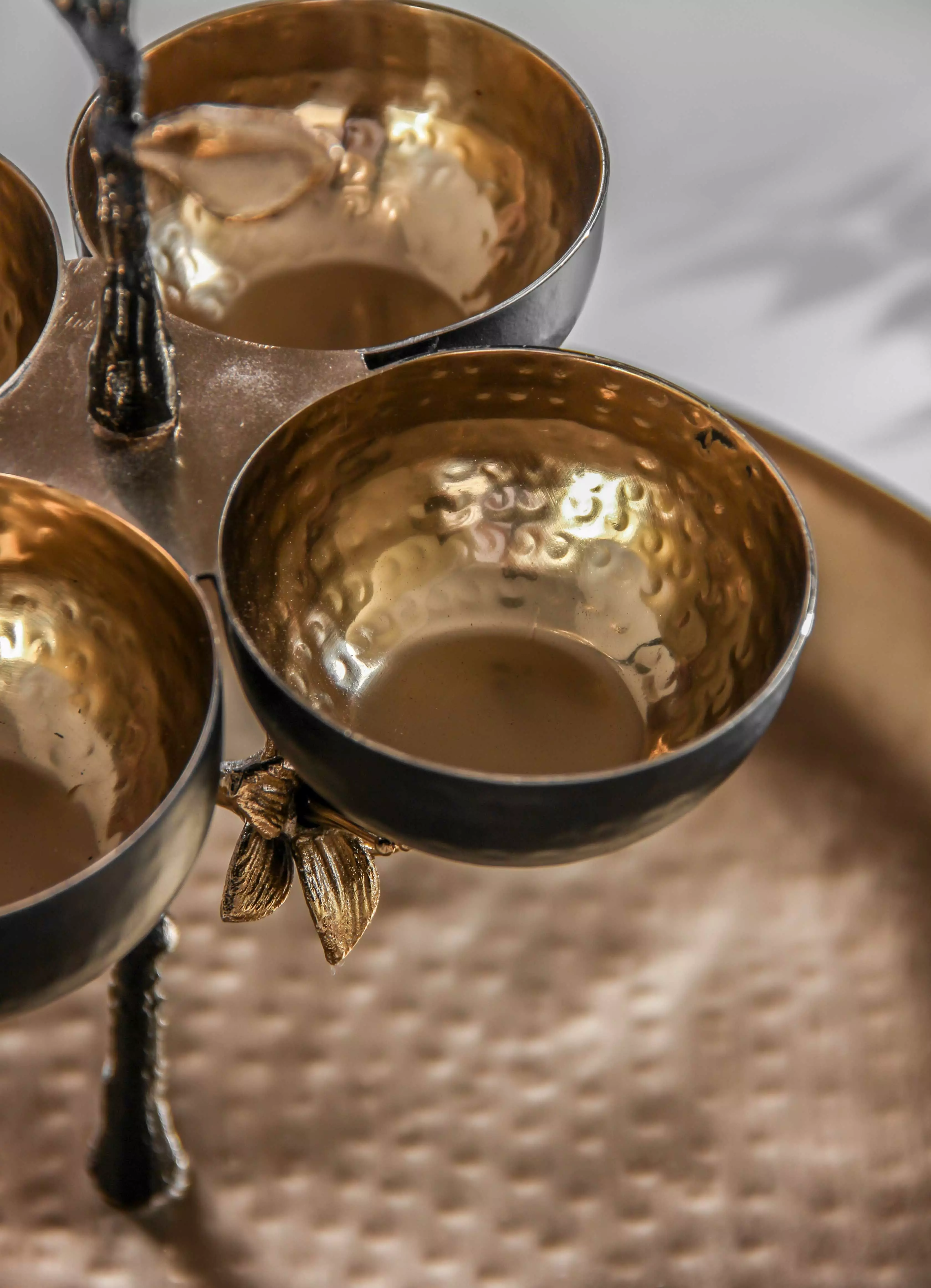 طبق تقديم ليلي عصري بتصميم عملي يجمع بين الأناقة والفخامة. الطبق ذو مساحة مناسبة ومزود بأربع أطباق صغيرة للصلصات مرفوعة على حامل منقوش مع أوراق جميلة. مصنوع من الستيل الهندي العالي الجودة فالمعادن الهندية من أجود أنواع المعادن في العالم وأكثرها متانة ومصنوع يدوياً بمهارة ودقة من قبل الحرفيين المهرة. يمكنك استخدامه لتقديم التمور مع الطحينة و صلصة الشوكولاه وأيضاً من تقديم الحلويات مع أربع صلصات مختلفة أو رقائق البطاطا مع صلصات من اختيارك.