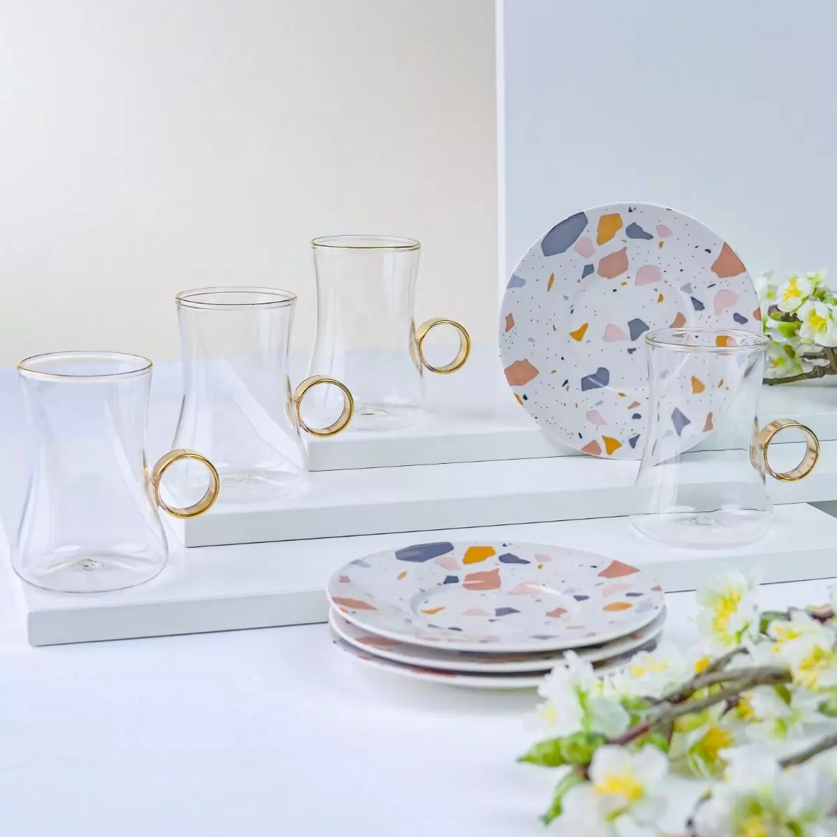 | خامة المنتج | خامة الكاسات: زجاج عالي البورون, خامة الصحون: بورسلين (نيو بون) |